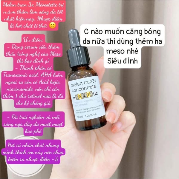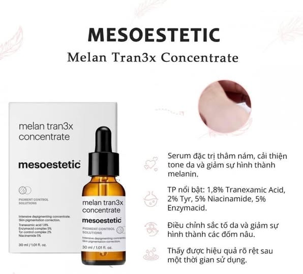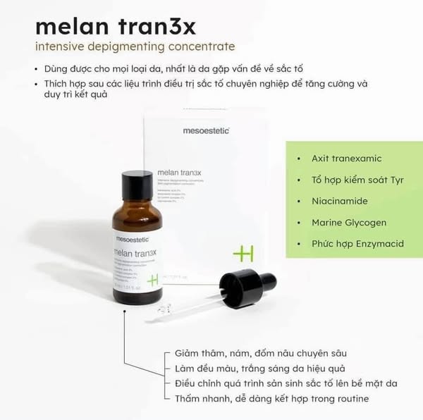 #Melan_tran3x_concentrate là serum #trị_thâm, làm #sáng_da, #mờ_nám chuyên sâu giúp điều trị và làm giảm sự xuất hiện của các đốm đen, loại bỏ melanin và điều chỉnh quá trình sản sinh sắc tố lên bề mặt da.