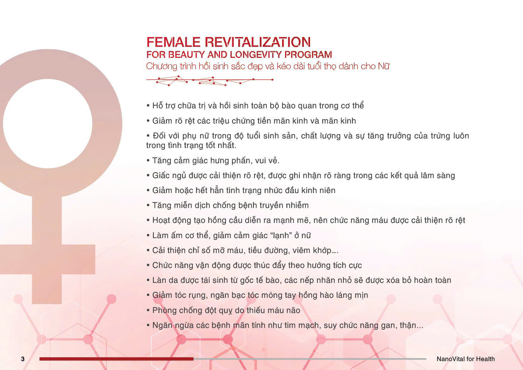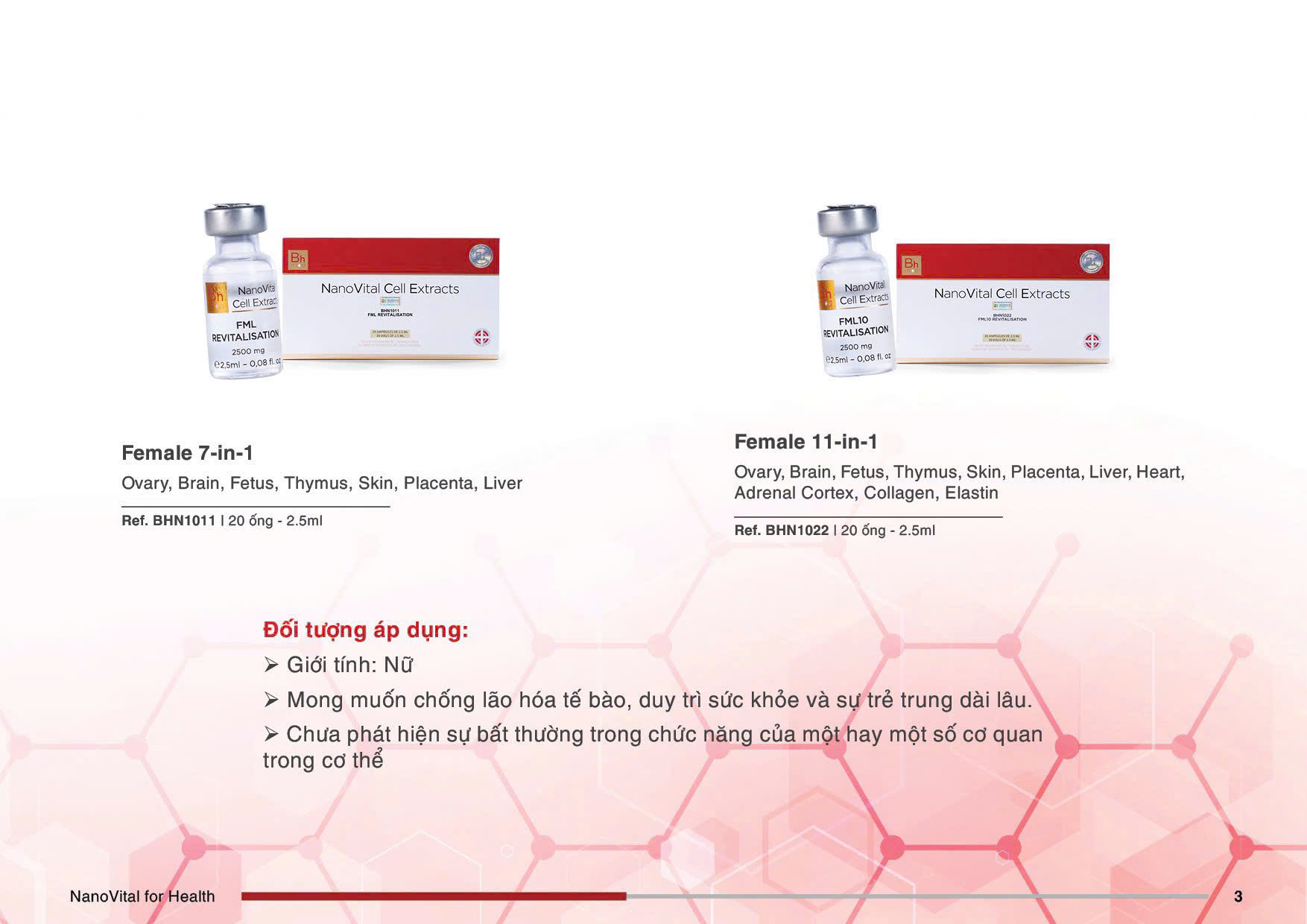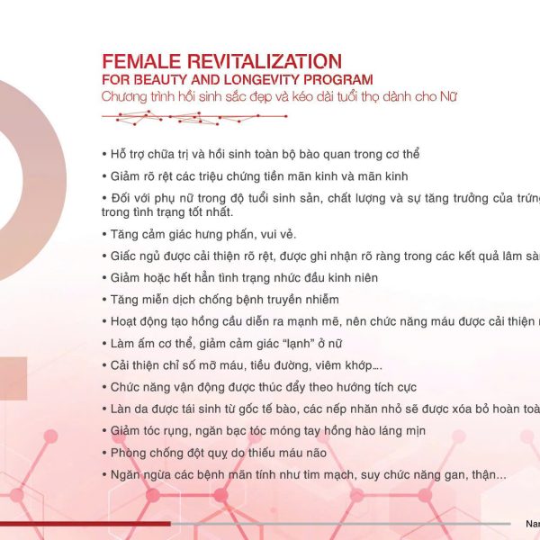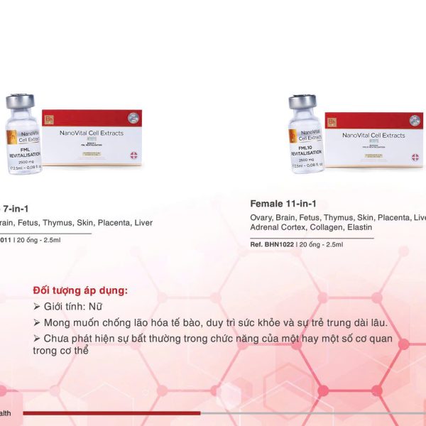 FEMALE Revitalisation (7 in 1) thuộc dòng sản phẩm THERAPEUTIC RANGE BODY – Organ Specific <10kDa (Dalton), 2500mg. Đây là liệu pháp tiên tiến ứng dụng dịch chiết mô tế bào sinh học chuyên biệt cơ quan, kết hợp công nghệ Nano Cell Therapy, giúp tái sinh năng lượng sống, cân bằng nội tiết và hỗ trợ phục hồi cơ thể từ gốc tế bào.